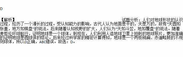 C. 地球是正圆形的 D. 地球是一个两极稍扁、赤道略鼓的不规则球体