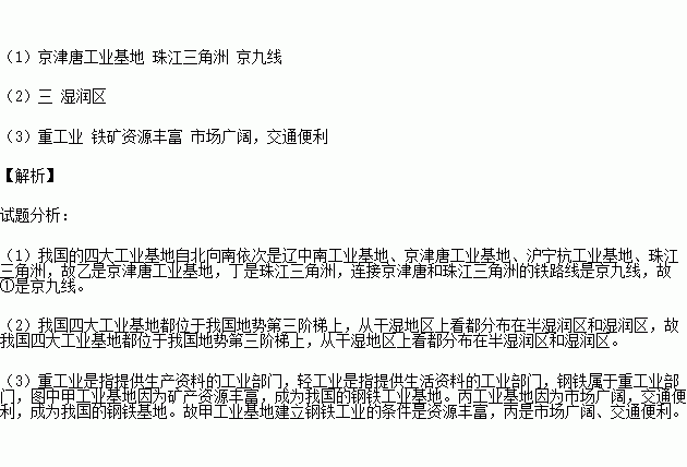 (1)图中甲、乙、丙、丁代表我国四大主要工业基地,其中乙工业基地是 ,丁工业基地是 ,将乙与丁两工业基地相连的铁路线①是 。