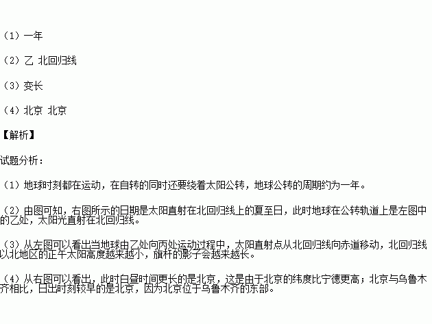 (3)读左图,当地球由乙处向丙处运动过程中,我们学校正午旗杆影子将________(变长/变短)。