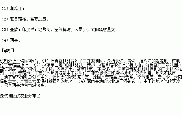 (1)原青藏铁路经过了三江源地区,它指:长江、黄河、 的发源地.