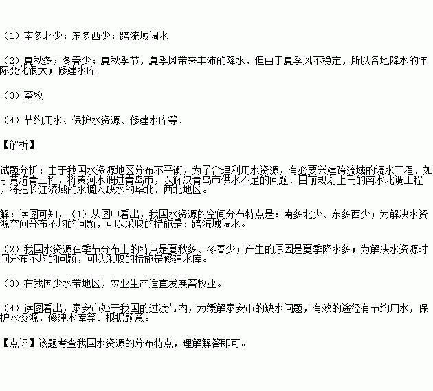 (4)读图可看出,泰安市处于我国的过渡带内.为缓解泰安市的缺水问题,有效的途径有哪些?(至少答出一条) 。