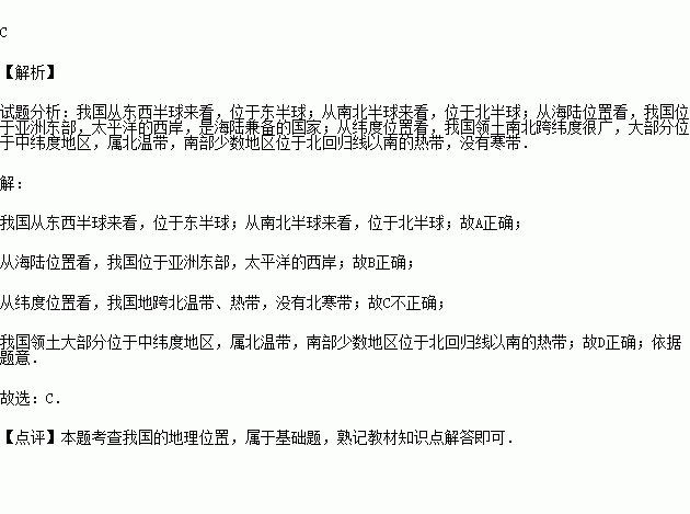 关于我国地理位置的叙述,不正确的是( )