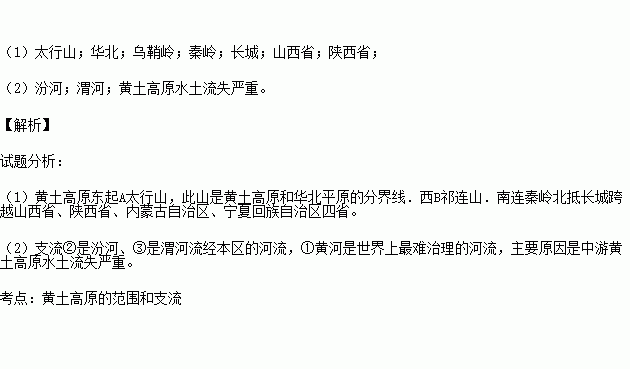 (1)黄土高原东起A______,此山是黄土高原和______平原的分界线。西至B_____。南抵______北连______跨越______、______、内蒙古自治区、宁夏回族自治区。