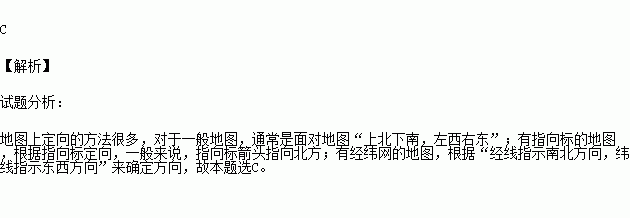 在画有指向标的平面图上,确定方向的一般方法是( )