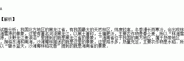 贴春联是我国的传统民俗,春联“林海雪原、沃野龙江麦浪滔”、“碧水蓝天,沙滩椰林稻花香”反映的省区分别是