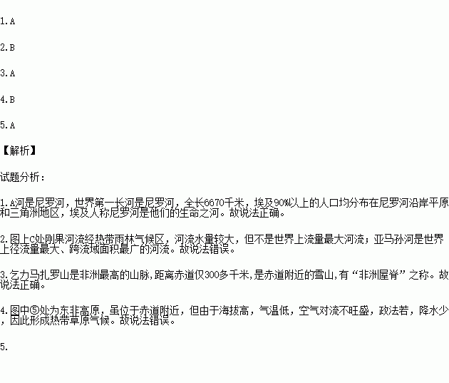 4.⑤处位于赤道附近,所以属于热带雨林气候。