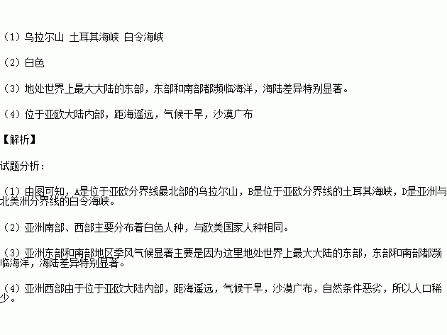 (4)请你从地理位置方面分析亚洲西部人口稀疏的原因。