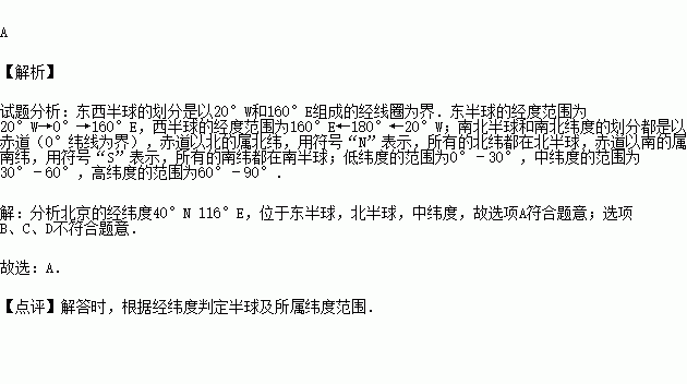 关于我国首都北京(40°N、116°E)位置的叙述正确的是( )