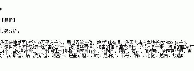 下列关于我国国土面积、疆界和邻国的表述,正确的是( )