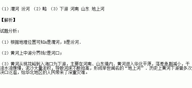 (2)黄河以河口作为上、中游的分界点,请用字母C在甲图中相应位置标注出来。