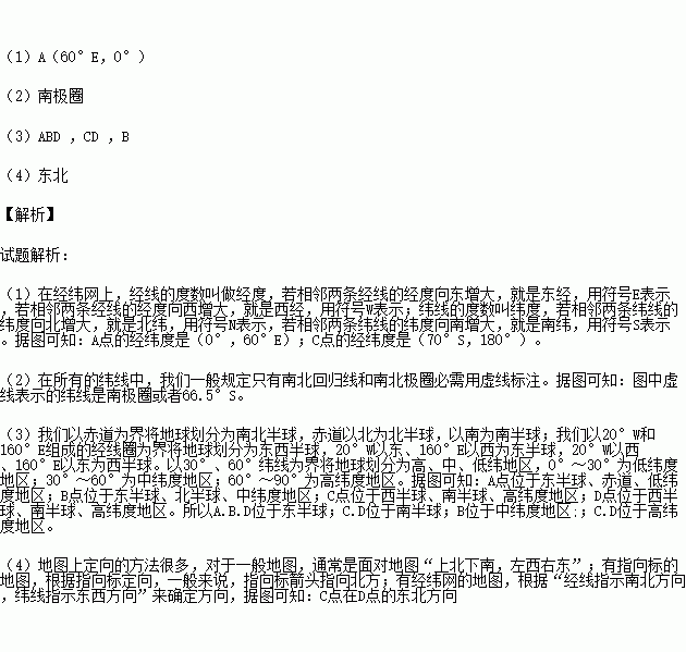 (3)A、B、C、D四点中位于东半球的是______,位于南半球的是_______;位于中纬度地区的是_______.