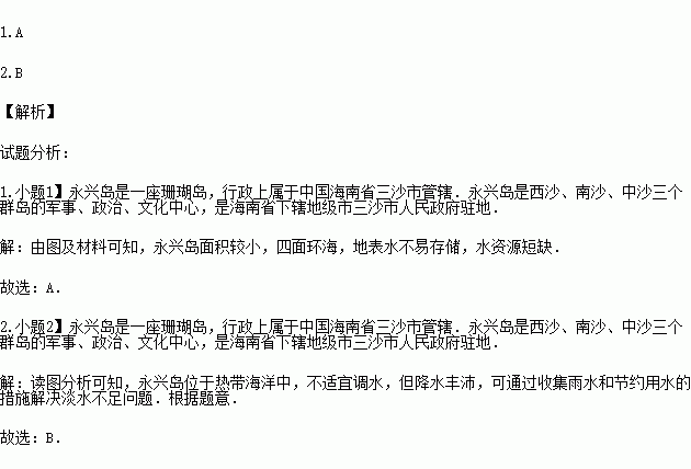 三沙市位于南海,于2012年6月21日设立,隶属海南省,是我国纬度最低的城市,下辖西沙群岛、南沙群岛、中沙群岛的岛礁及其海域.三沙市人民政府驻地永兴岛,其面积有2.1平方千米.长期以来,水资源短缺是困扰永兴岛发展的重要问题.由于近年采取了一些措施这一问题才有所改善.右图为三沙市位置示意图.读图,回答问题.