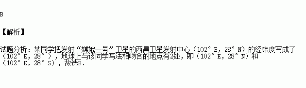 某同学把西昌卫星发射中心(102°E,28°N)的经纬度写成了(102°E, 28°),地球上与该同学写法相吻合的地点有几处( )