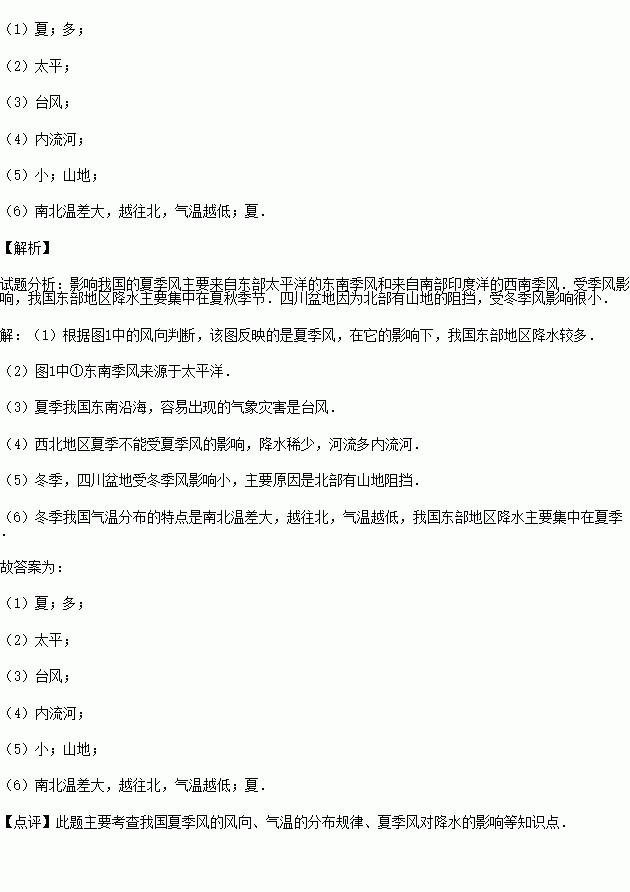 (1)根据图1中的风向判断,该图反映的是 (冬、夏)季风,在它的影响下,我国东部地区降水较 (多、少).