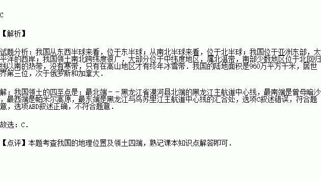 A.从东西半球看,我国位于东半球,从南北半球看,我国位于北半球