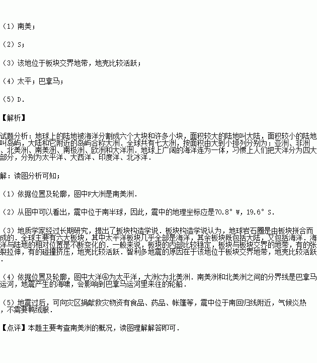 (4)地震产生的海啸经过大洋④,到达大洲C.该大洋是 洋.大洲F和大洲C之间的分界线 运河里来往的轮船受到一定影响.
