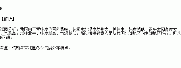 寒假期间,张虹随父母外出旅行。到达目的地时,他们的衣着由厚厚的棉服,换成了凉爽的夏装。请问:张虹一家的旅行路线最有可能的是( )