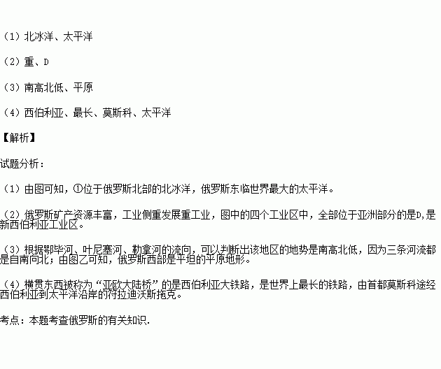 (2)俄罗斯矿产资源丰富,工业侧重发展 (轻、重)工业。图中A、B、C、D四大工业区中,全部位于亚洲部分的是 工业区(填字母)。