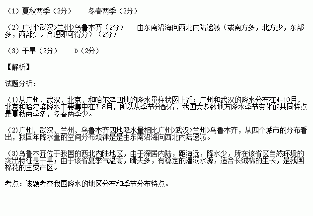 (2)请将广州、兰州、武汉、乌鲁木齐四城市年降水量的大小由大到小排序 ,并总结我国年降水量的空间分布规律是 。