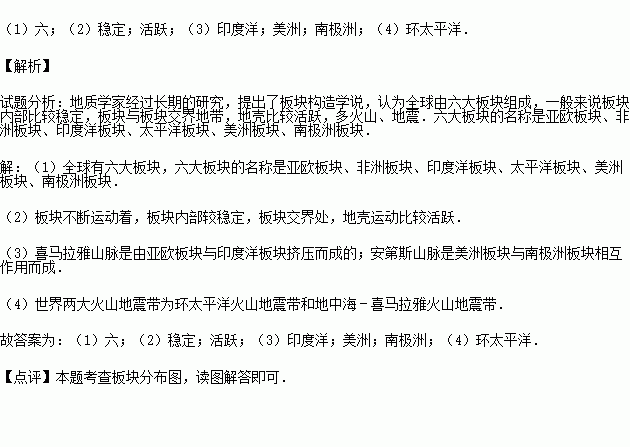 (2)板块不断运动着,板块内部较 (活跃或稳定),板块交界处,地壳运动比较 (活跃或稳定).