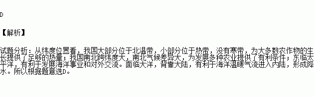 B.我国南北跨纬度大,南北气候差异大,为发展多种农业提供了有利条件。