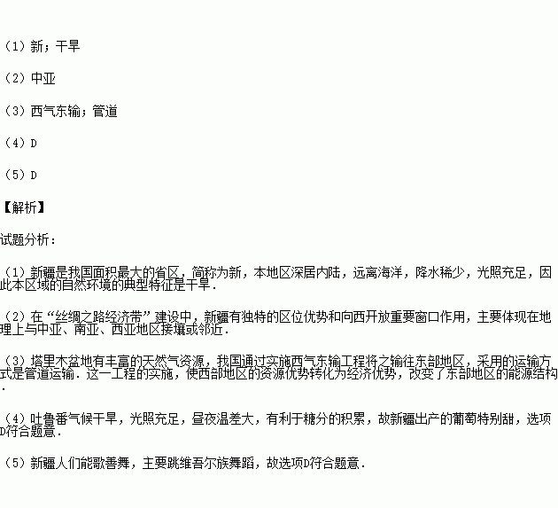(1)新疆是我国面积最大的省区,简称为 ,本地区自然环境的典型特征是 。