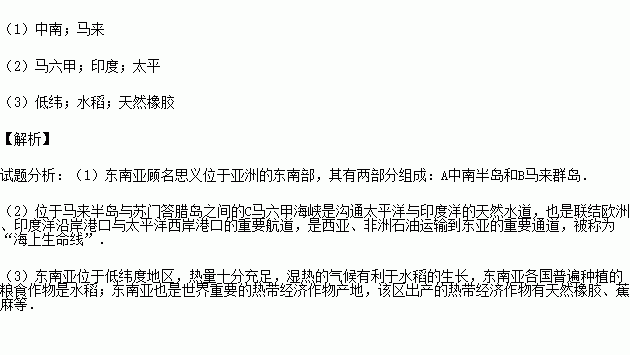 (3)东南亚位于 (低纬、高纬)地区,热量充足,湿热的气候有利于 (粮食作物)的生长,东南亚也是世界上 、蕉麻等经济作物的最大产地.