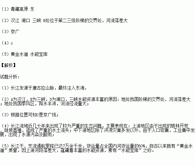 (2)图中字母所代表的地理事物:A支流是 ,D是长江中、下游的分界点 ;B是我国最大的水利枢纽 ,简述B处水能资源丰富的原因。