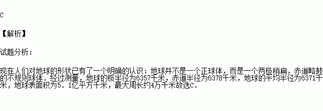 C.地球平均半径约4万千米,赤道周长约6371千米