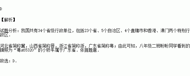 八年级二班盼盼同学看到一辆牌照为“粤A65320”的小轿车从门前经过,她认为这辆车该属于( )
