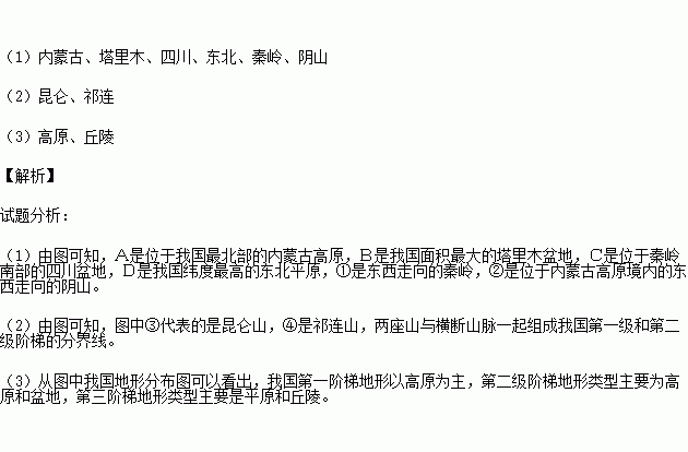 A 高原,B 盆地, C 盆地, D 平原,① 山脉,② 山脉。