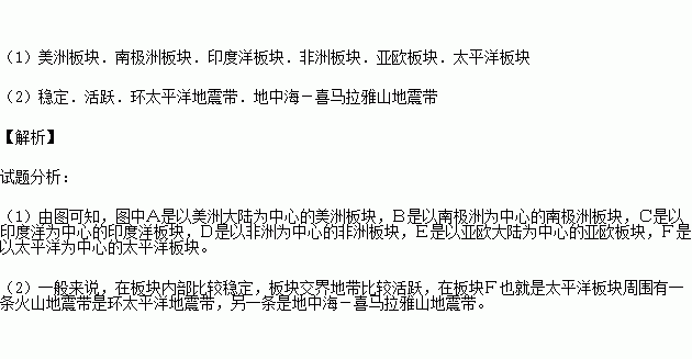 (2)板块内部比较________,板块交界地带比较___________。在板块F周围有一条火山地震带是______________________,另外一个重要的火山地震带是___________________________________。