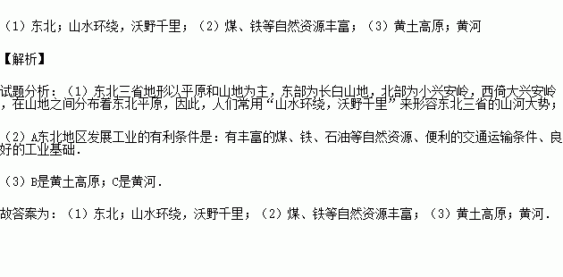 (3)地形区B是 .河流C是 .