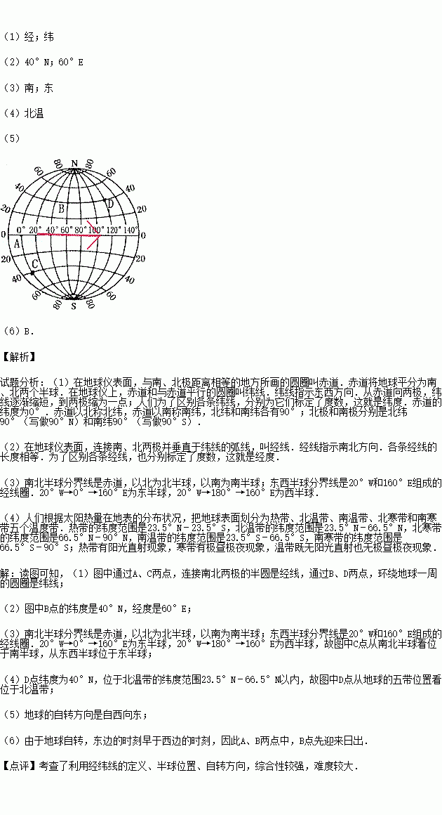(1)图中通过A、C两点,连接南北两极的半圆是 线;通过B、D两点,环绕地球一周的圆圈是 线.