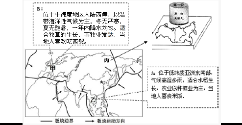 (3)甲为欧洲西部,位于中纬度地区大陆西岸,以温带海洋性气候为主,冬无严寒,夏无酷暑,一年内降水均匀.适合牧草的生长,畜牧业发达,当地人喜欢吃西餐.