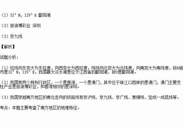 (1)B城市的经纬度是 ,D是我国面积最大的淡水湖 湖。