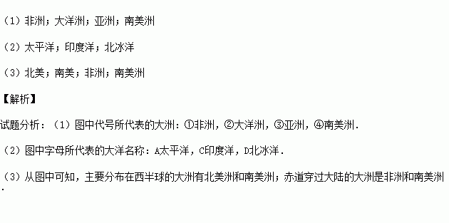 (3)从图中可知主要分布在西半球的大洲有____洲和____洲;赤道穿过大陆的大洲是_______和________。