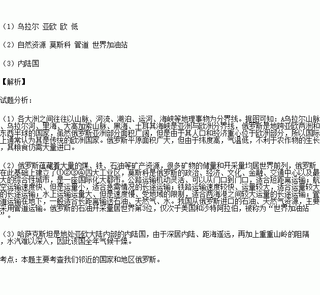 (1)图中A山脉是__________山脉,它是________两大洲的分界线,但俄罗斯却被公认为______洲国家。俄罗斯平原面积广大,但粮食仍需大量进口,从气候条件看,由于纬度高,气温 ,不利于农作物的生长。