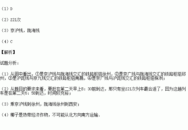 (1)图中铁路枢纽及交汇的铁路线,对应正确的是( )