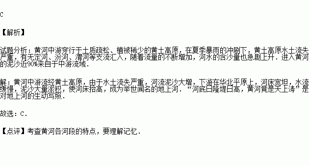 A.上游水流湍急,水能丰富 B.中游水土流失严重