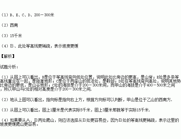 (1)图中字母中位于山脊的是 ,位于陡崖的是 ,位于鞍部的是 ,易形成小河的是 ,山峰甲的海拔范围是 米到 米。