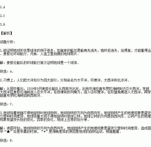 1.图中“●”处为西班牙,麦哲伦船队从西班牙出发,按照“→”方向绕地球一周,麦哲伦船队环球航行证明( )