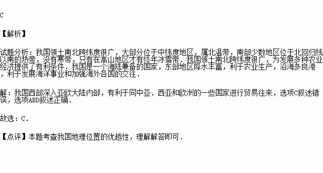 有关我国地理位置及其优越性的表述,不正确的是( )