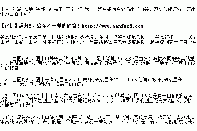(1)写出以下各处表示的地形部位名称:甲______乙_____丙_____丁_____