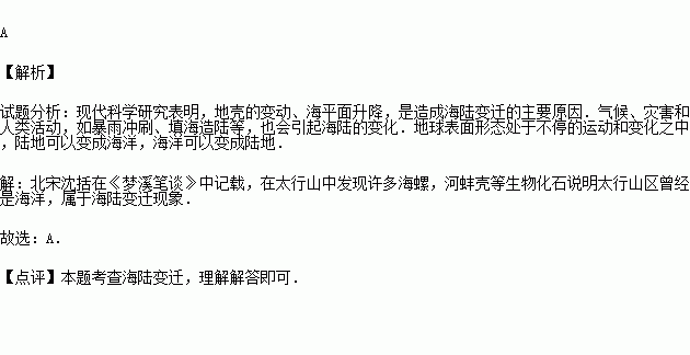 北宋沈括在《梦溪笔谈》中记载,在太行山中发现许多海螺,河蚌壳等生物化石.这一记载说明:( )