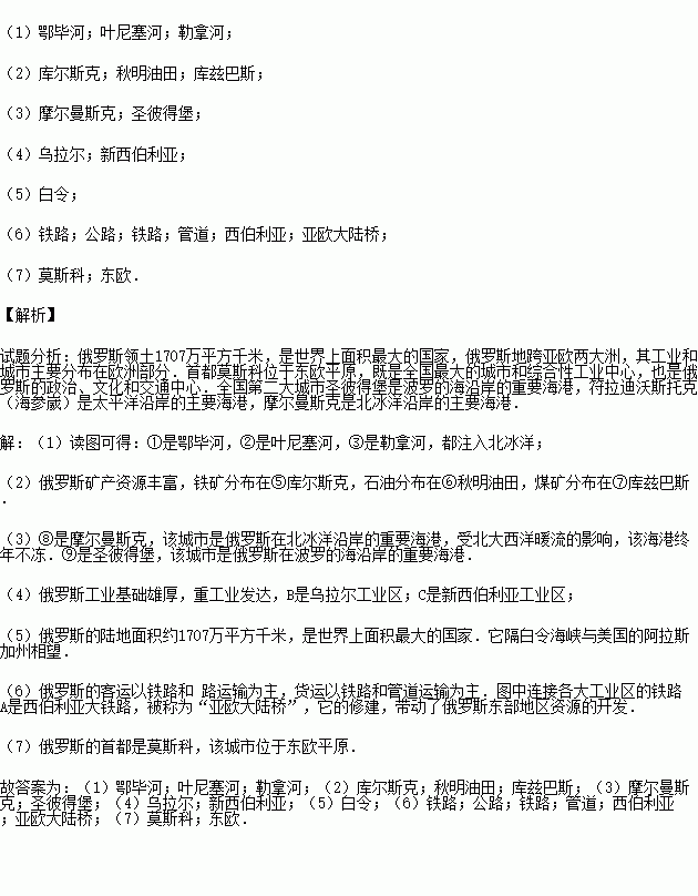 (6)俄罗斯的客运以 和 运输为主,货运以 和 运输为主.图中连接各大工业区的铁路A是 大铁路,被称为“ ”,它的修建,带动了俄罗斯东部地区资源的开发.