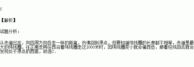 某人从赤道出发,分别向正东、正南、正西、正北方向各走1000千米,最后这个人将位于( )