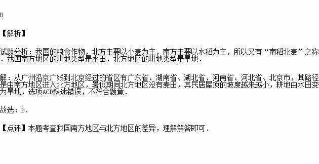 暑假期间,家住广州的小明决定乘火车北上,沿京广线到北京爬长城,他沿途将看到的是( )