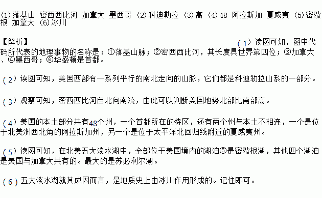 (1)Âä»ùɽ ÃÜÎ÷Î÷±ÈºÓ ¼ÓÄôó Ä«Î÷¸ç (2)¿ÆµÏÀÕÀ (3)¸ß (4)48 °¢À˹¼Ó ÏÄÍþÒÄ (5)ÃÜЪ¸ù ¼ÓÄôó (6)±ù´¨ ¡¾½âÎö¡¿£¨1£©¶Áͼ¿ÉÖª£¬Í¼ÖдúÂëËù´ú±íµÄµØÀíÊÂÎïµÄÃû³ÆÊÇ£º¢ÙÂä»ùɽÂö£»¢ÚÃÜÎ÷Î÷±ÈºÓ£¬Æä³¤¶È¾ßÊÀ½çµÚËÄλ£»¢Û¼ÓÄô󡢢ÜÄ«Î÷¸ç£»¢Þ»ªÊ¢¶ÙÊÇÊ×¶¼¡£ £¨2£©¶Áͼ¿ÉÖª£¬ÃÀ¹úÎ÷²¿ÓÐһϵÁÐÆ½ÐеÄÄϱ±×ßÏòµÄɽÂö£¬ËüÃǶ¼ÊǿƵÏÀÕÀɽϵµÄÒ»²¿·Ö¡£ £¨3£©¹Û²ì¿ÉÖª£¬ÃÜÎ÷Î÷...
