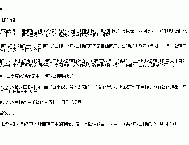 A.季节变化 B.昼夜交替 C.太阳东升西落 D.昼夜现象